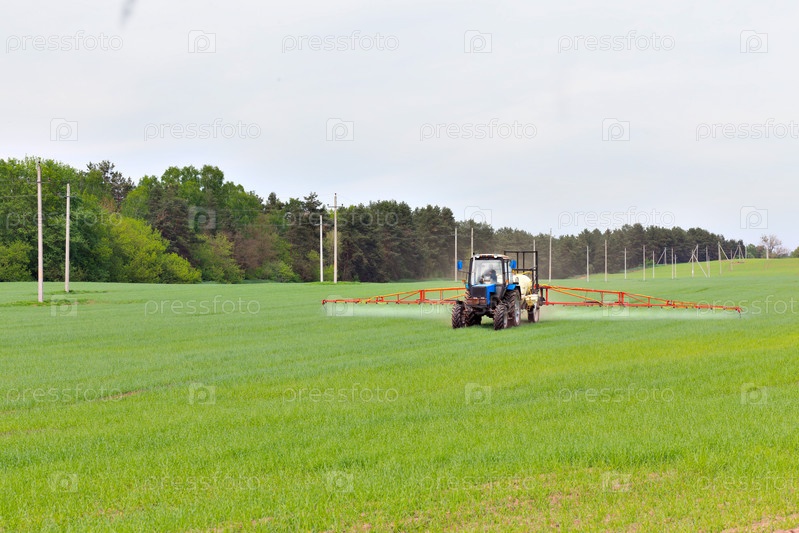 Сельскохозяйственная машина удобряет зеленое поле весной