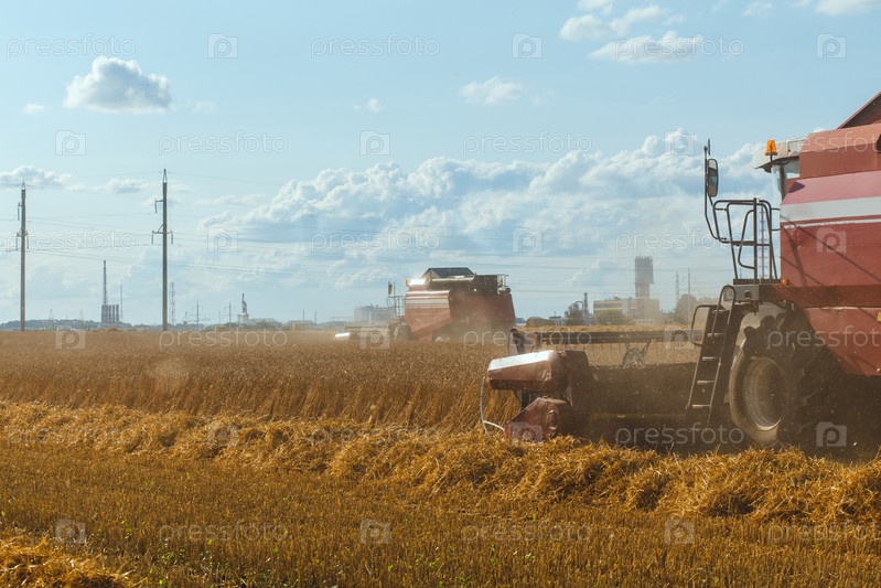 Зерноуборочный комбайн собирает спелую пшеницу в солнечный летний день