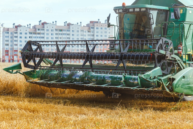 Гродно, Беларусь - 25 июля 2020 г.: Комбайн собирает спелую пшеницу John Deere на зерновом поле возле жилого массива Ольшанка