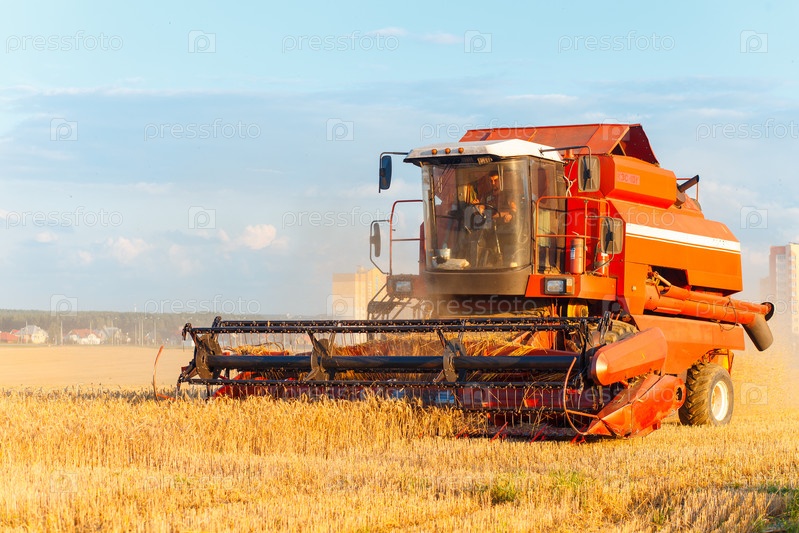 ГРОДНО, БЕЛАРУСЬ - 02 августа 2016 года в Гродно, Беларусь, комбайн работает на пшеничном поле возле жилых домов