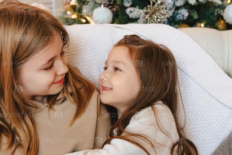 Уютный домашний портрет двух счастливых улыбающихся маленьких девочек-сестер, обнимающихся, проводящих досуг вместе дома, сидящих на кровати возле украшенной рождественской елки