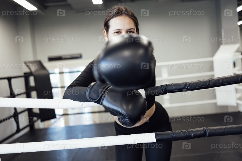 Сильная латинская боксерша на ринге в фитнес-зале. Спортивная девушка тренирует тайский бокс Муай для бодибилдинга и концепции здорового образа жизни. Тренировка в спортивном клубе