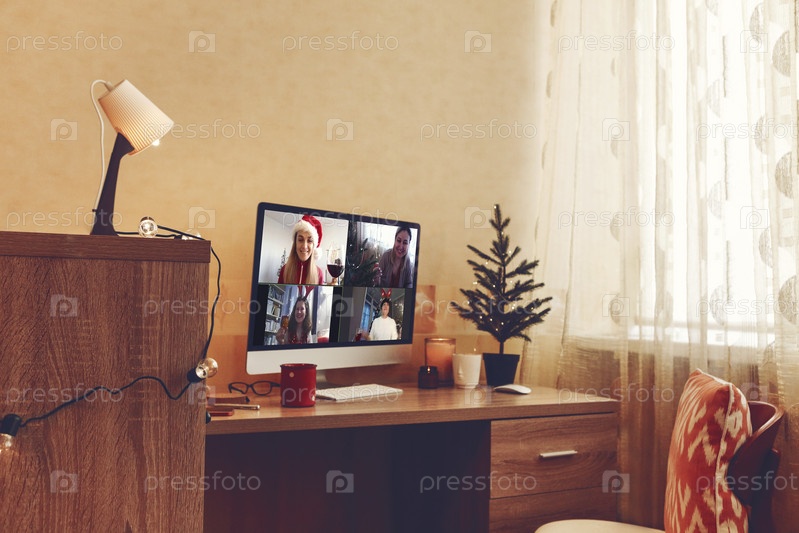 Компьютер на столе в комнате. Празднование Рождества онлайн в связи с подготовкой к празднику