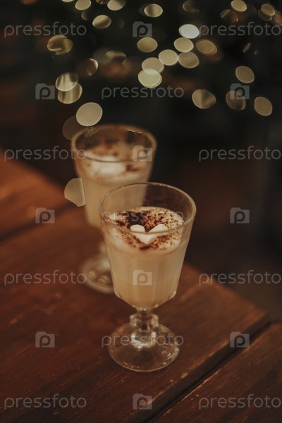 Традиционные осенние и зимние коктейли, алкогольные или безалкогольные. Два стакана коктейлей гоголь-моголь с какао и зефиром