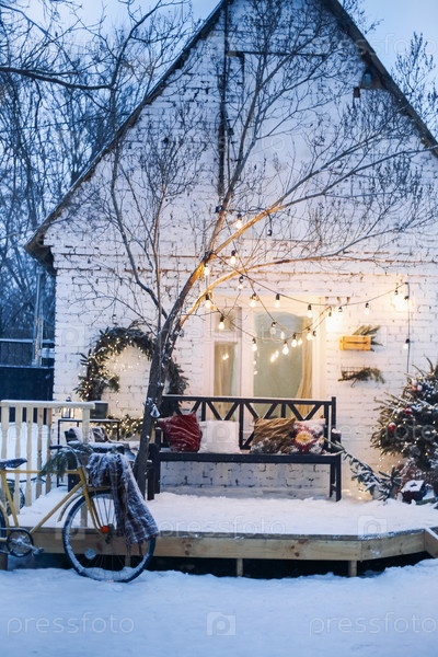 Домашнее крыльцо, украшенное заснеженными ветками елки