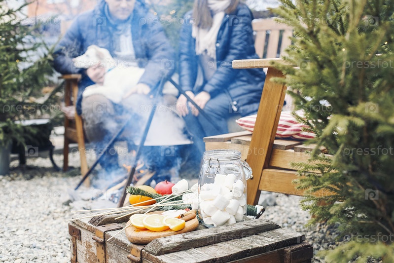 Прекрасная пара с милой собакой сидит на заднем дворе в окружении молодых хвойных деревьев,