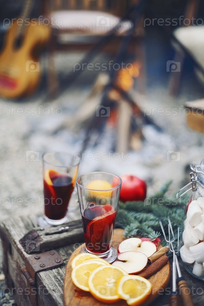 Два стакана горячего глинтвейна с цитрусовыми, яблоками, палочками корицы, гвоздикой и анисом на фоне деревянного стола