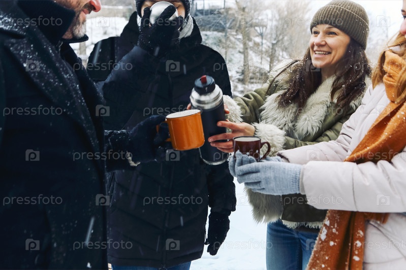 Люди на зимнем курорте на зимних каникулах. Друзья отдыхают, пьют горячий кофе