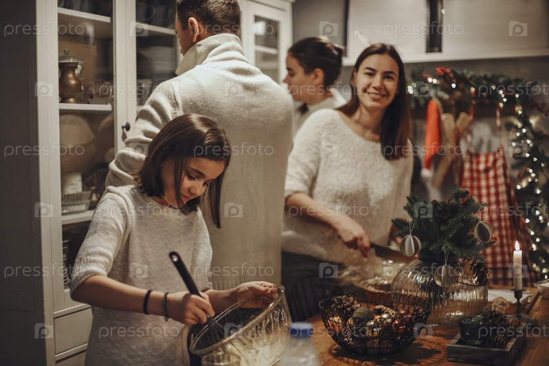 Семья вместе готовит традиционный праздничный ужин в канун Рождества в уютной домашней обстановке, две дочери помогают родителям накрыть новогодний стол, готовят на кухне, украшенной к зимним праздникам