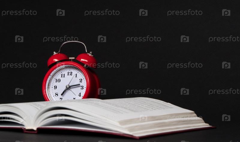 Книга и будильник на черном фоне