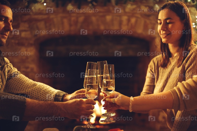 Люди чокаются бокалами с шампанским, собираясь у камина в загородном доме, кадрированный снимок. Друзья пьют алкоголь, празднуют событие у костра дома. избирательный фокус. Концепция праздника