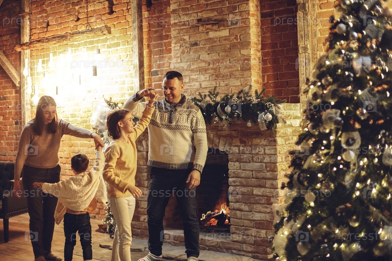 Счастливые семейные родители с двумя детьми танцуют вместе возле камина и рождественской елки в уютном загородном доме, украшенном к рождественским праздникам. Мать, отец и дети празднуют Новый год в фермерском доме