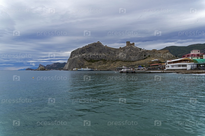 Вид на прибрежную гору с средневековой генуэзской крепостью через бухту. Судак, Крым, пасмурный день в сентябре