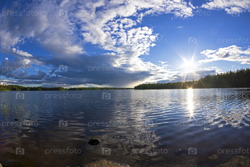 Красивые облака над плесом на реке Кереть. Карелия, Россия, конец июня