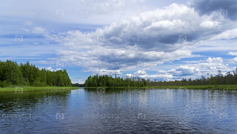 Красивые облака над плесом на реке Кереть. Карелия, Россия, конец июня