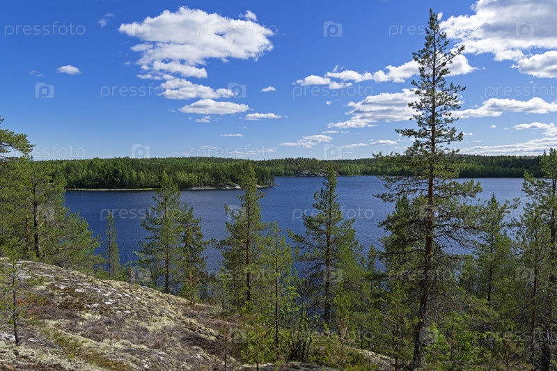Сосны на высоком скалистом берегу Белого моря. Кандалакшский залив, Чупинская губа, Остров Олений. Карелия, Россия, конец июня