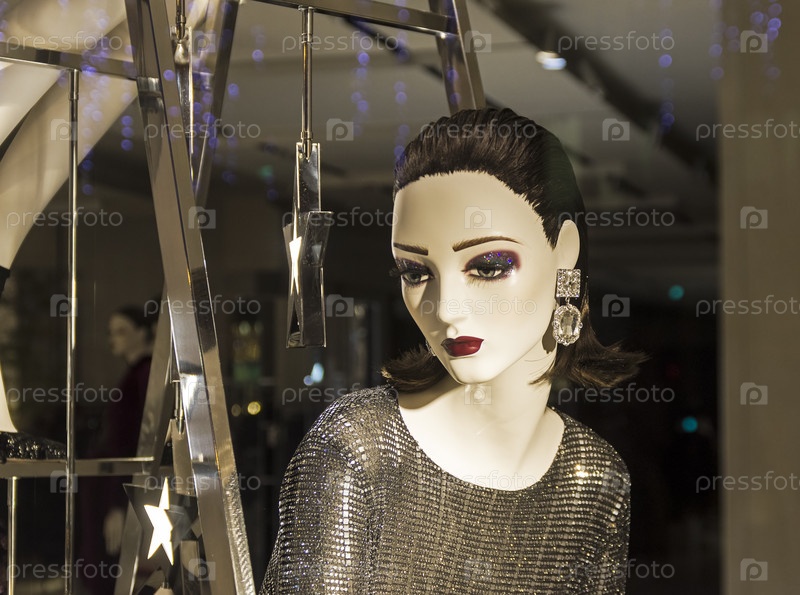 Витрина дорогого парижского универмага. Манекен в блестящем платье
