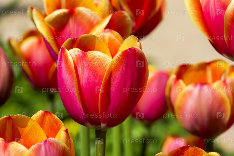 Красивые красно-желтые тюльпаны на клумбе. Солнечный день в мае. Аптекарский Огород (филиал ботанического сада МГУ), Москва