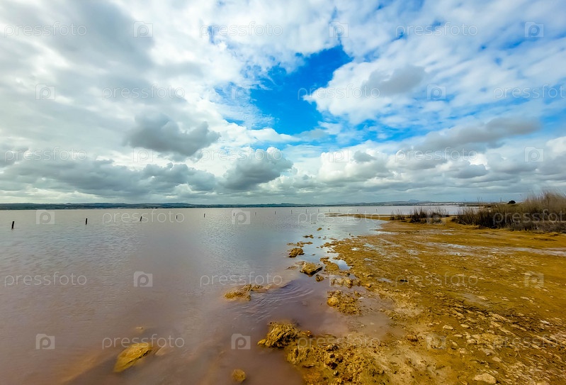 Голубые облака над розовым соленым озером в Торревьехе, Испания