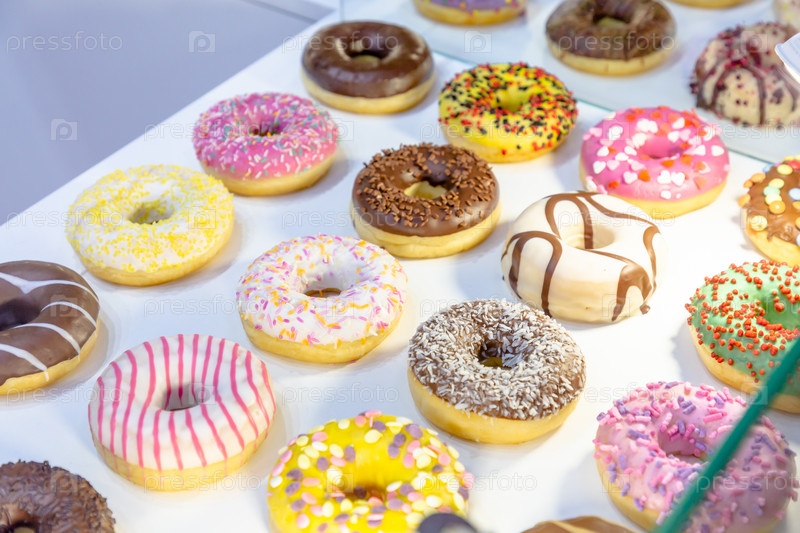 В кондитерской выставлены разные пончики