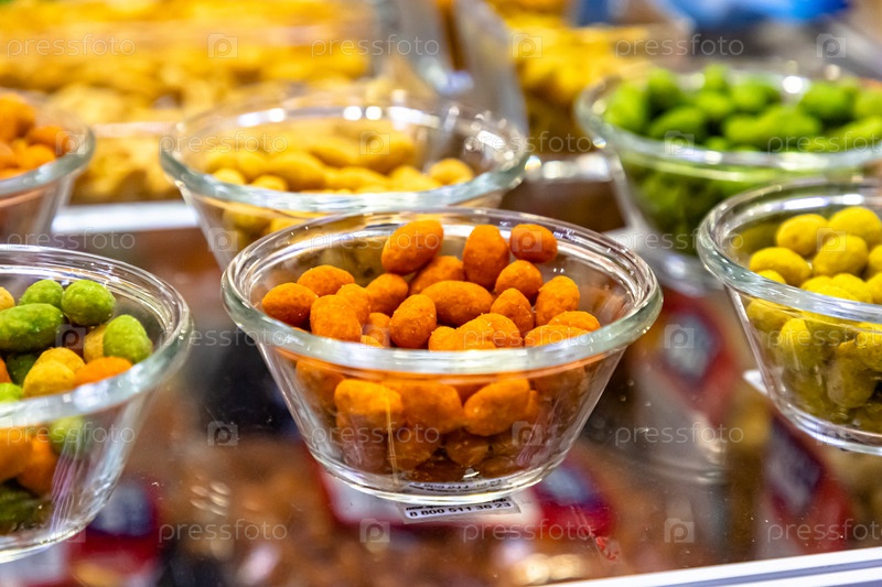 Орехи в специях, куркуме, паприке, перце, соли и др. на витрине