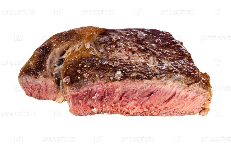 Нарезать жареный стейк из говядины рибай средней прожарки, изолированный