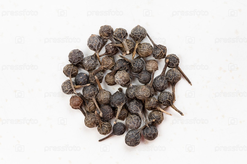 Куча хвостатого перца (кубеба) крупным планом на сером