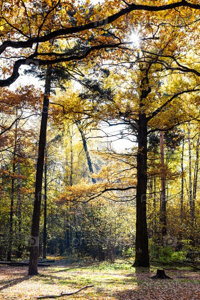 Дубы на лугу в залитом солнцем лесу осенью