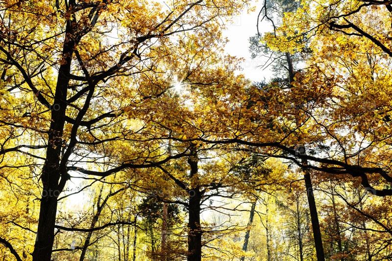Пожелтевшие кроны дубов в залитом солнцем лесу