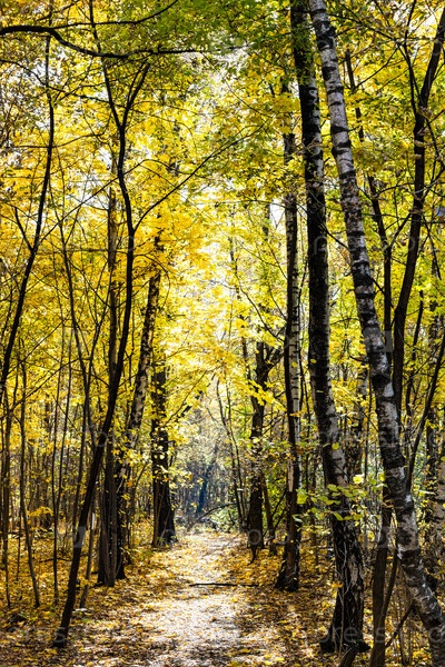 Залитая солнцем тропинка в лесу городского парка в осенний день