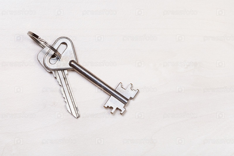 Ключи от двери на связке ключей на бледно-коричневом столе