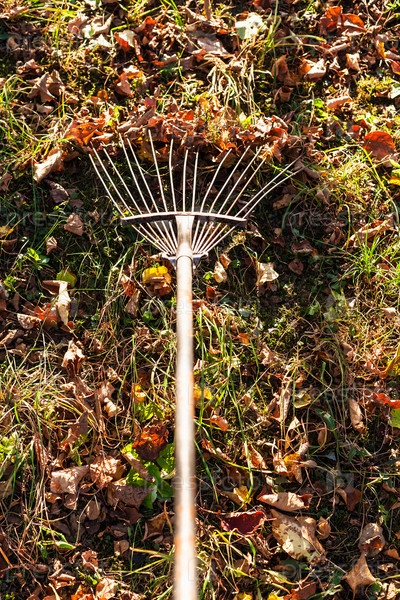 Уборка опавших листьев на заднем дворе граблями
