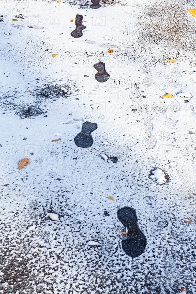 Замерзшие следы на мокрой дороге, покрытой снегом