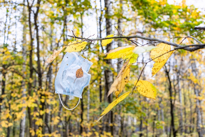 Грязная медицинская маска для лица висит на ветке дерева