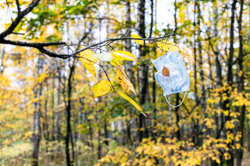 Санитарная маска висит на ветке дерева осенью