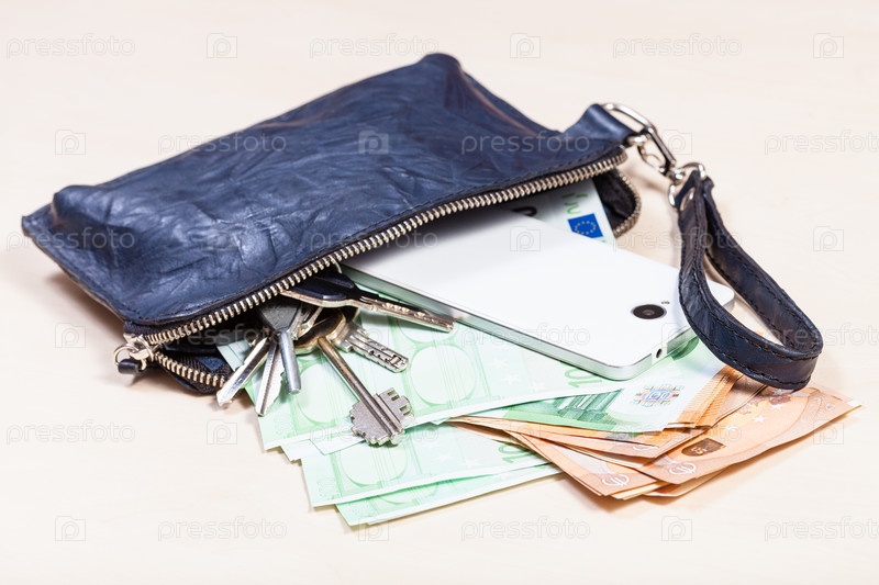 Сумочка с телефоном, ключами и многими евро на столе