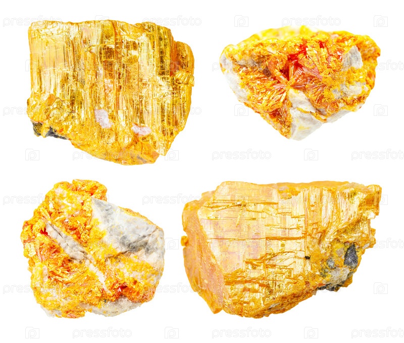 Набор различных кристаллов Орпимента, изолированных на белом
