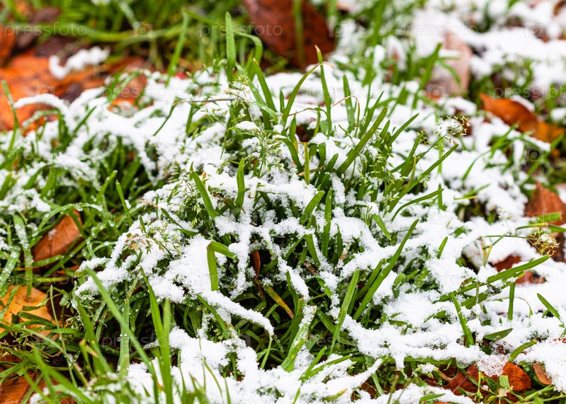 Зеленая трава, покрытая первым снегом на лужайке