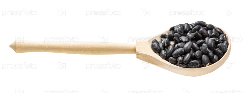 Деревянная ложка с сырой черной черепаховой фасолью изолирована