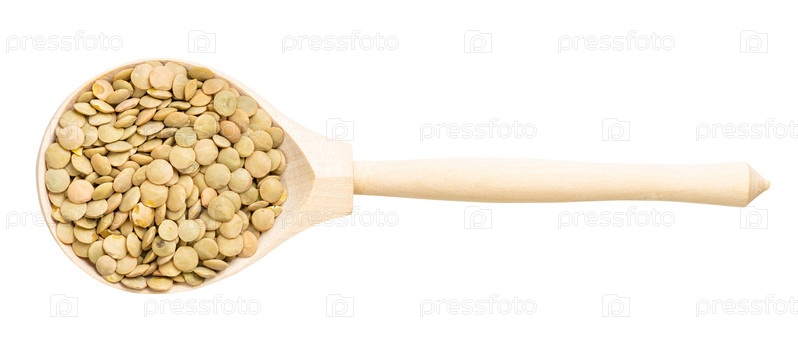 Вид сверху на деревянную ложку со светло-зеленой чечевицей