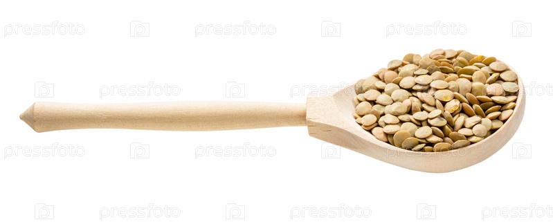 Ложка с сырой цельной светло-зеленой чечевицей изолирована