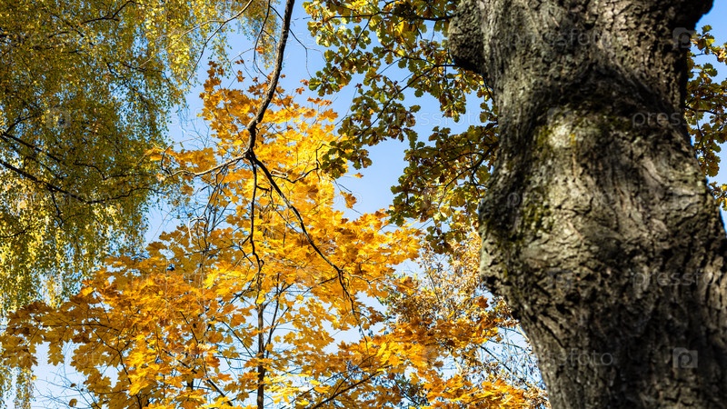 Вид снизу на ветку дуба с оранжевыми листьями