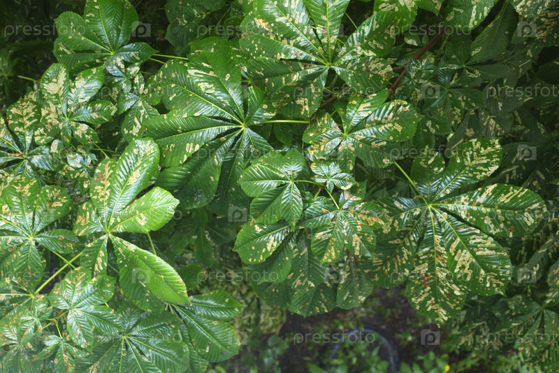 Мокрые листья каштана,поврежденные каштановой молью