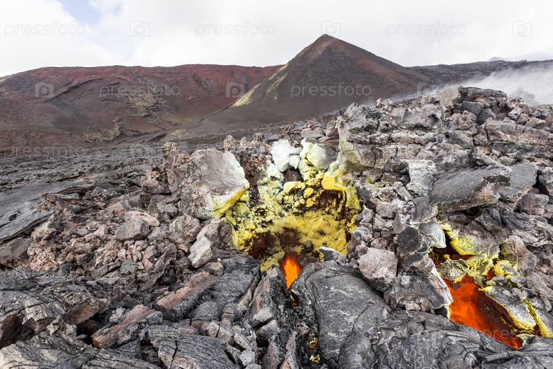 Дымящиеся, серные, активные фумаролы у вулкана Толбачик, Камчатка, Россия