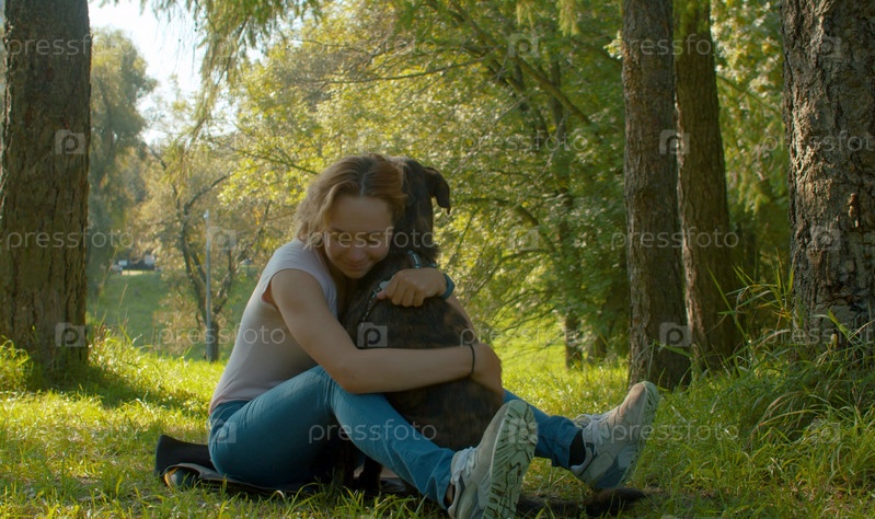 Привлекательная улыбающаяся женщина обнимает свою милую собаку