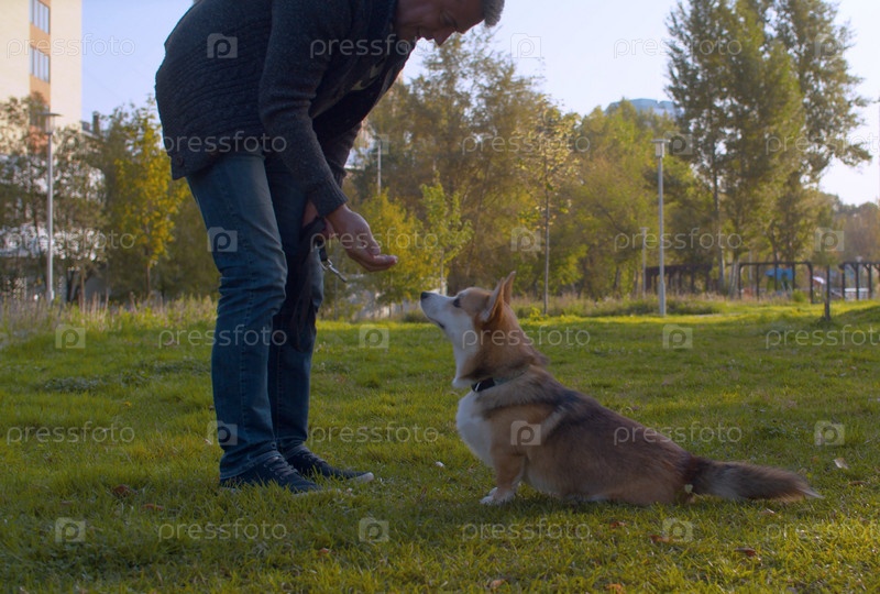 Мужчина с собакой корги в парке летом. Хозяин кормит собаку
