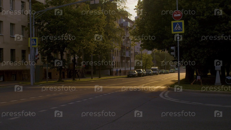 Городской пешеходный переход на закате. Автомобили на улице