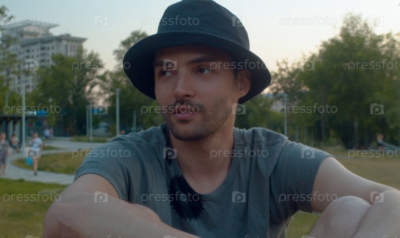Портрет молодого красавца, сидящего в парке