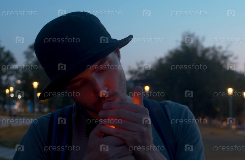 Портрет молодого человека закуривает сигарету на фоне ночного городского парка