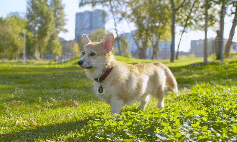 Красивая собака корги стоит на траве и оглядывается